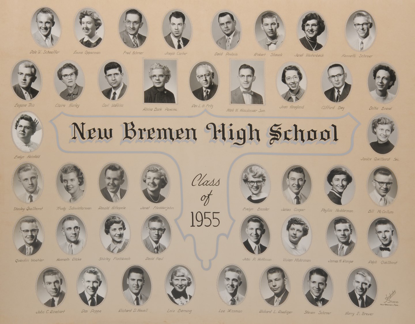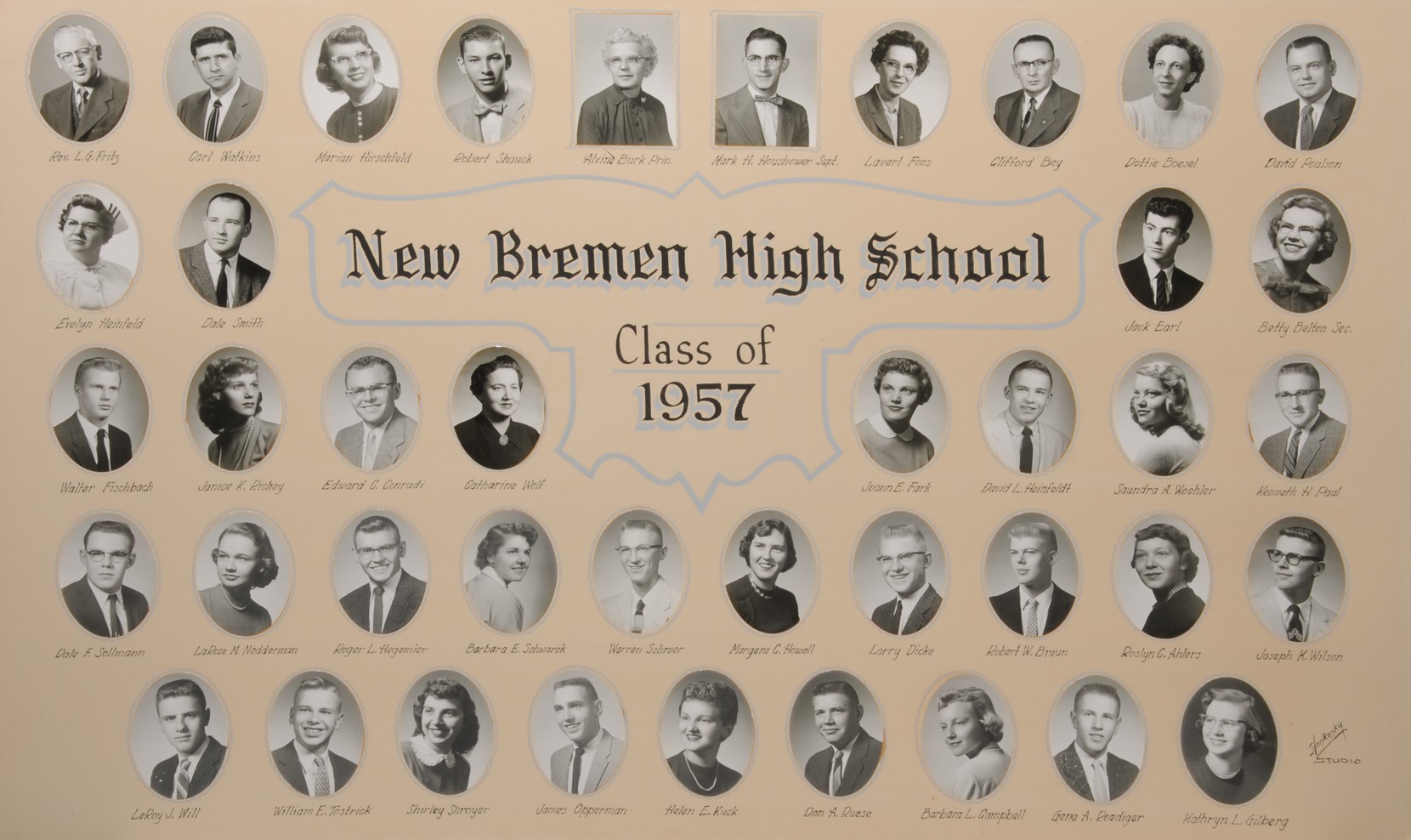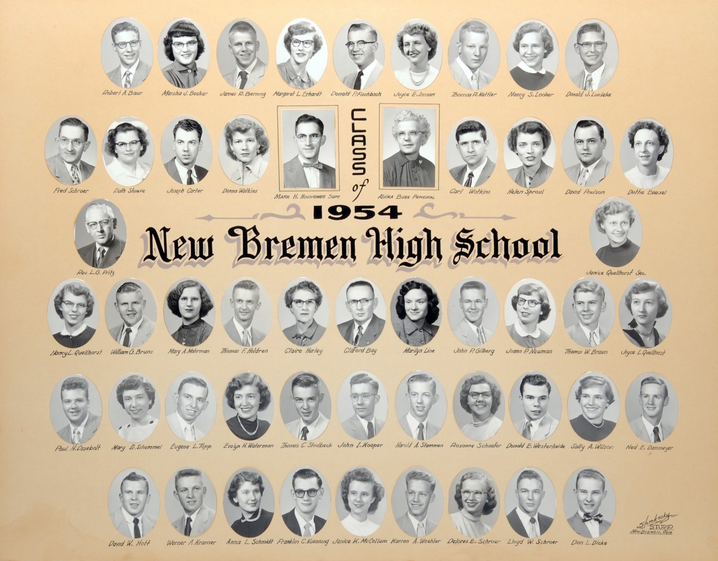 The New Bremen Historic Association, an Ohio non-profit corporation, is posting the graduation class lists and photos graciously provided by the Board of Education, New Bremen Local and the staff of the New Bremen High School. The New Bremen Historic Association has posted information on this website as a service to the citizens of New Bremen and past, present and future graduates of New Bremen High School. The New Bremen Historic Association is not responsible for the accuracy of the photos presented. These photos shall not be copied or distributed without the express written consent of the New Breme Historic Association and the Board of Education, New Bremen Local School District.