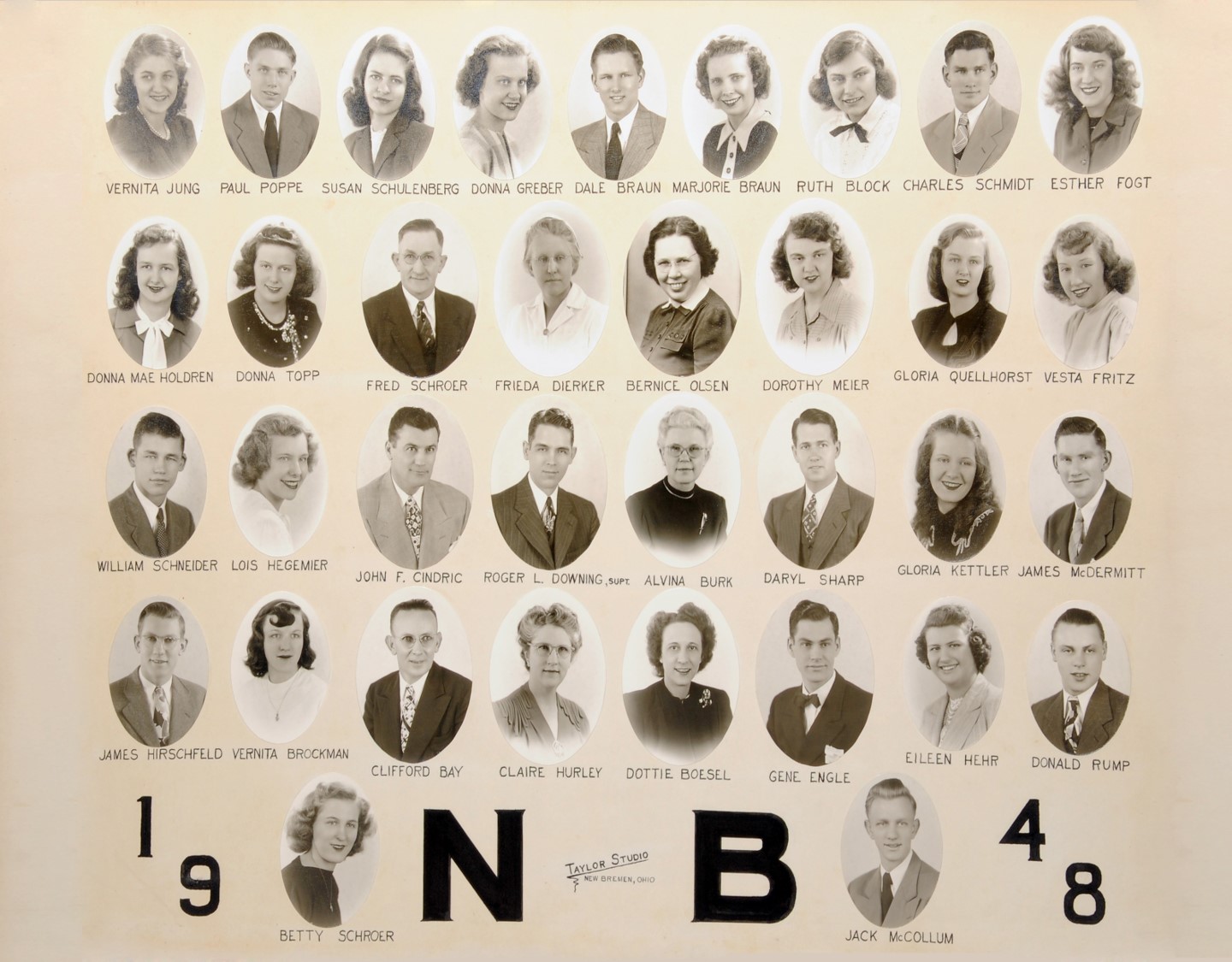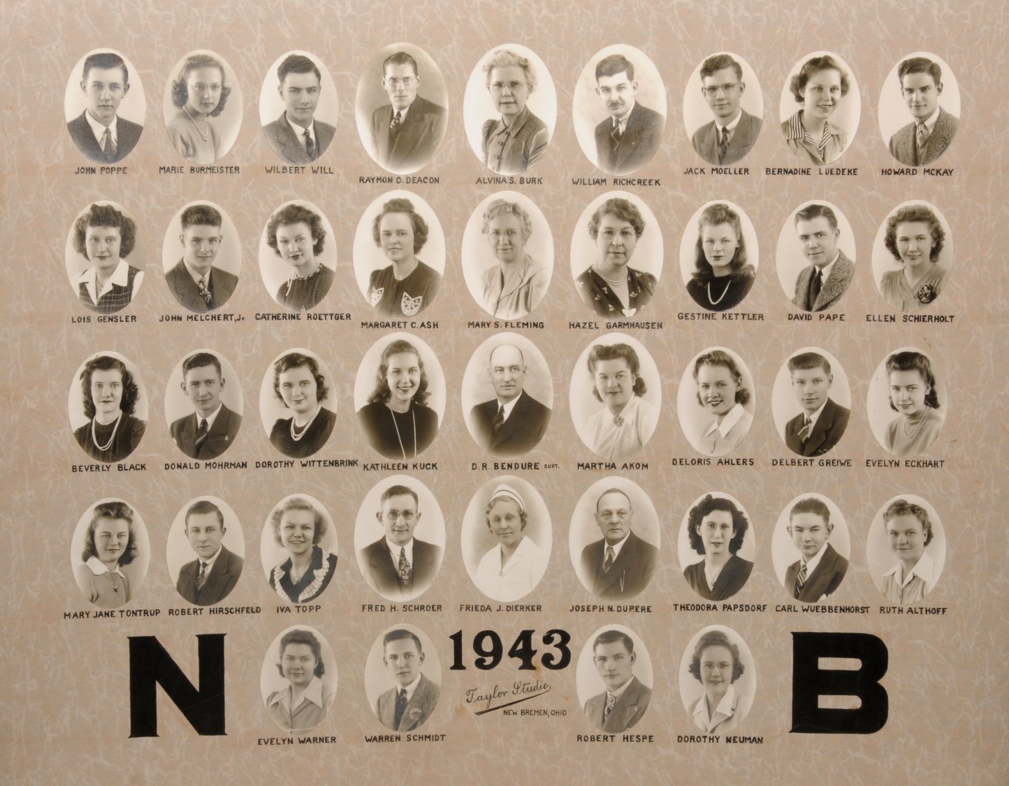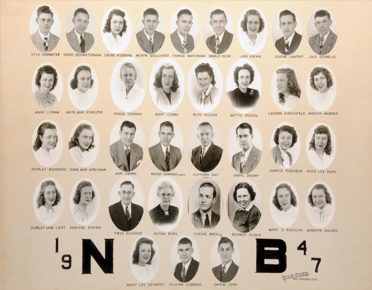 The class lists and photos are provided by the Board of Education; New Bremen Local School District and we are publishing these lists and photos to honor the New Bremen Schools and its graduates. If any person or individual desires to have their photos or likeness or any information removed or redacted from this website for any reason, please contact us at info@newbremenhistory.org. We shall use our best and reasonable efforts to accommodate your request.