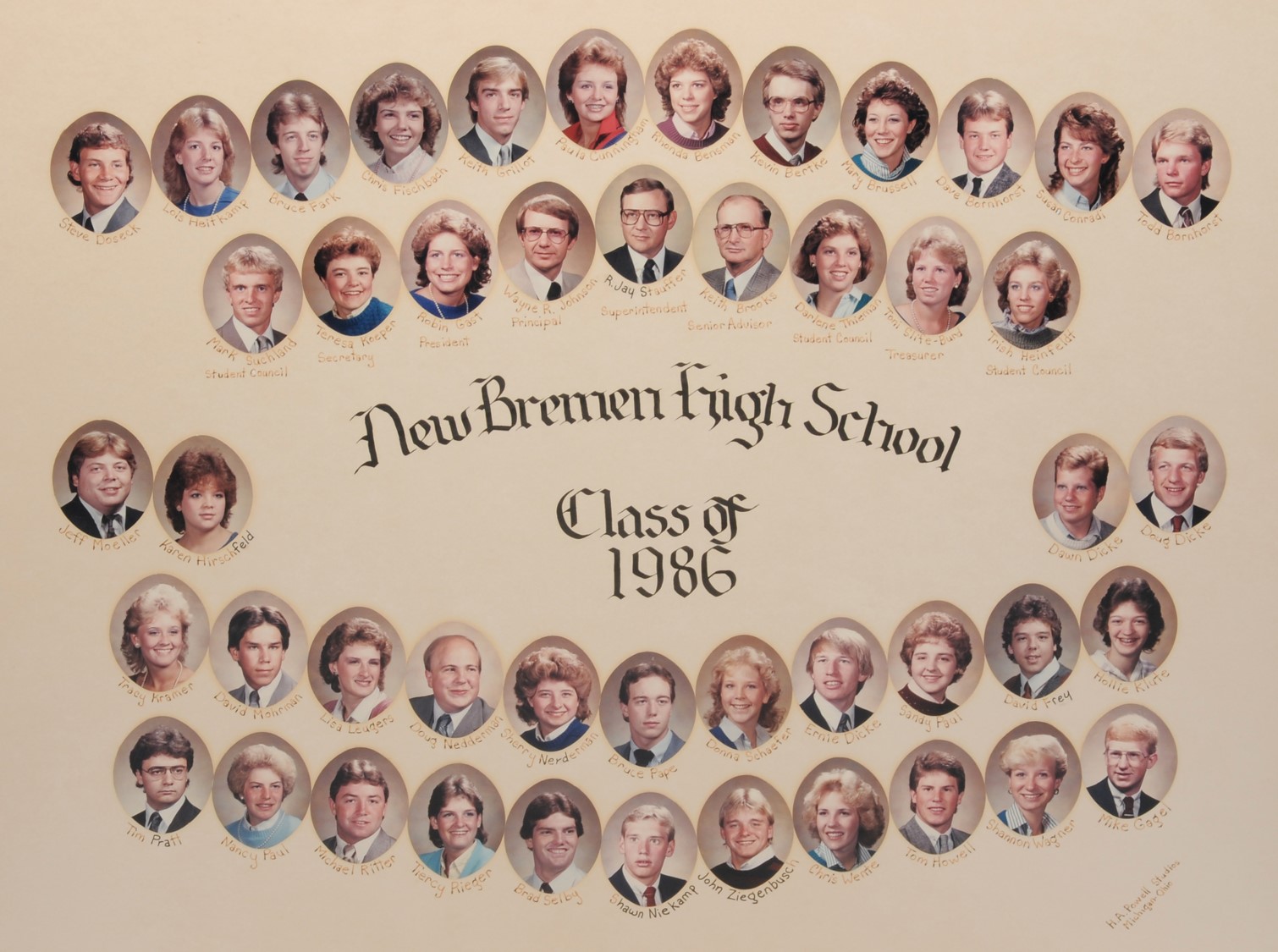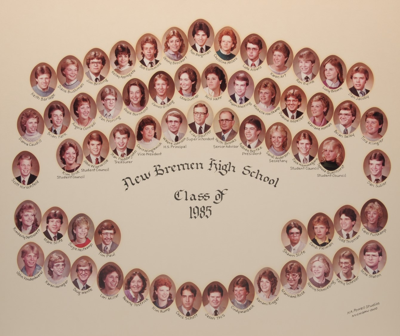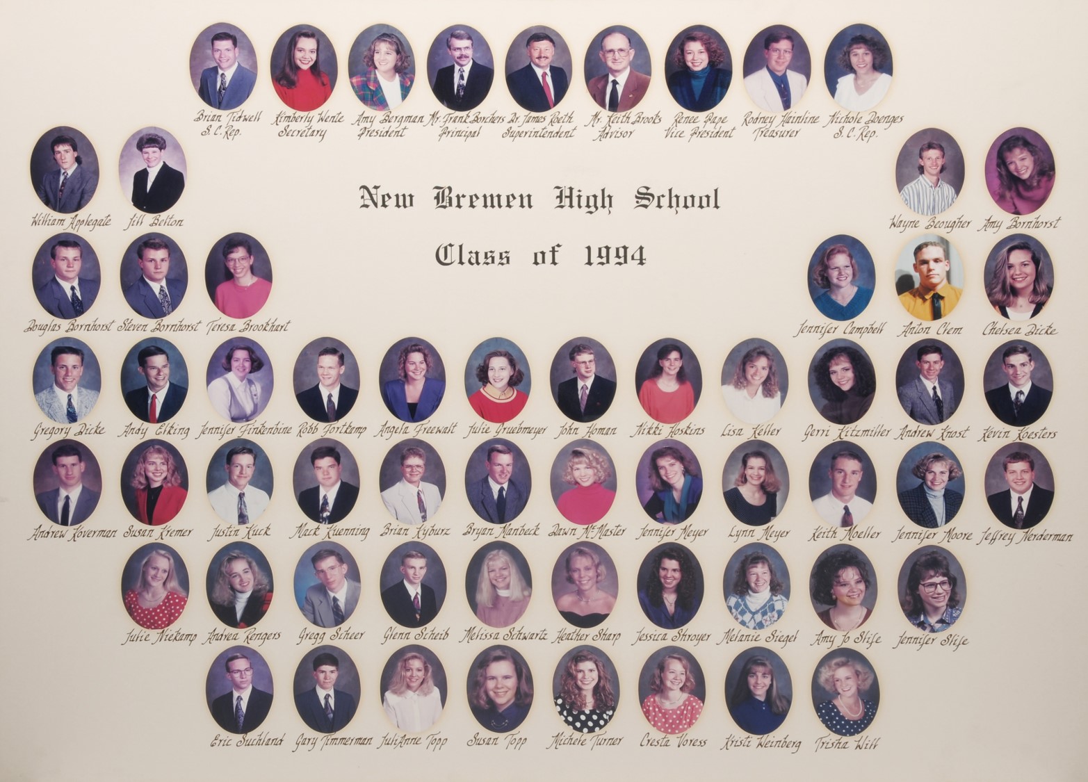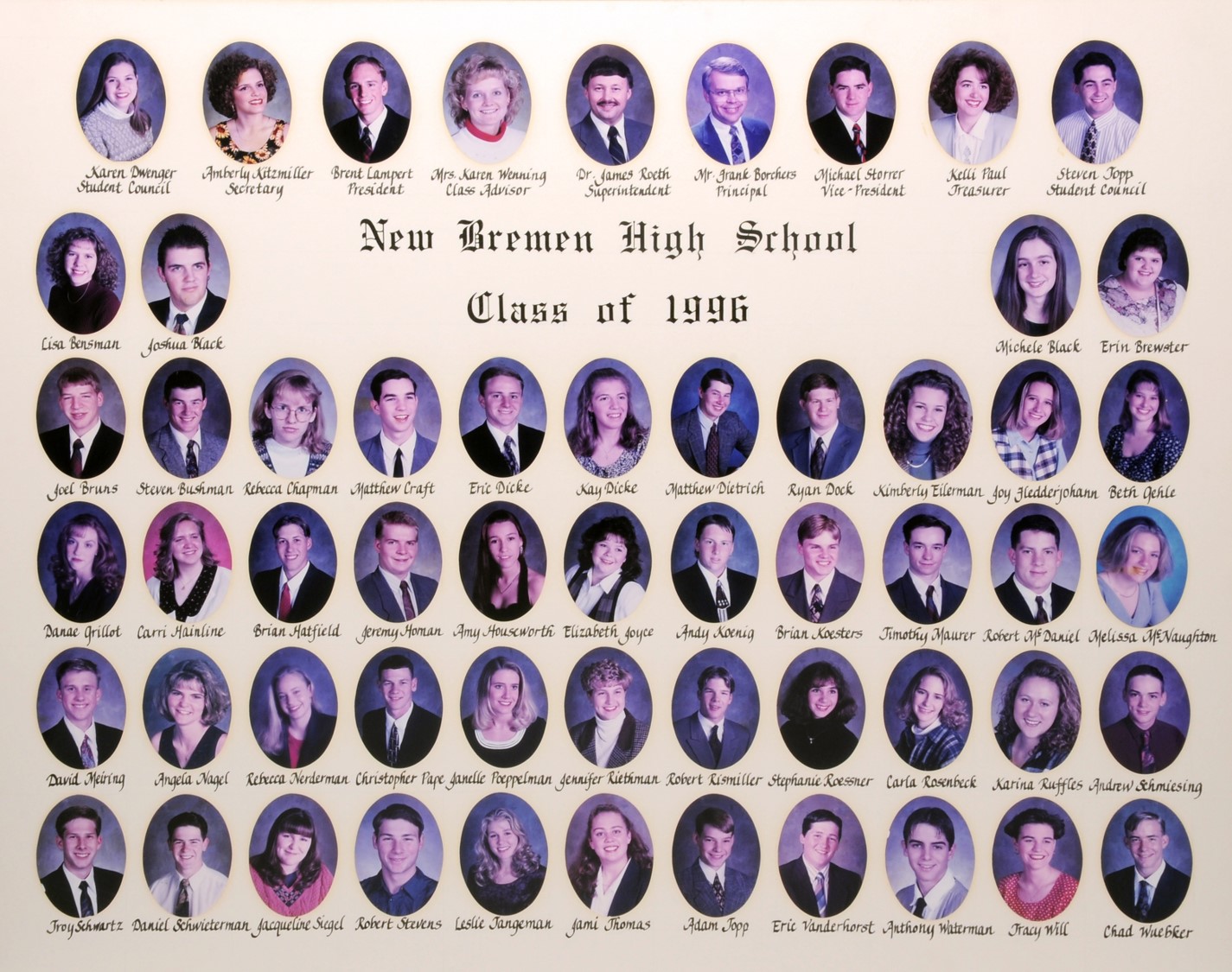 The New Bremen Historic Association, an Ohio non-profit corporation, is posting the graduation class lists and photos graciously provided by the Board of Education, New Bremen Local and the staff of the New Bremen High School. The New Bremen Historic Association has posted information on this website as a service to the citizens of New Bremen and past, present and future graduates of New Bremen High School. The New Bremen Historic Association is not responsible for the accuracy of the photos presented. These photos shall not be copied or distributed without the express written consent of the New Breme Historic Association and the Board of Education, New Bremen Local School District.