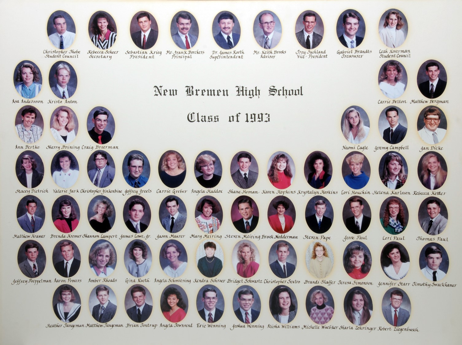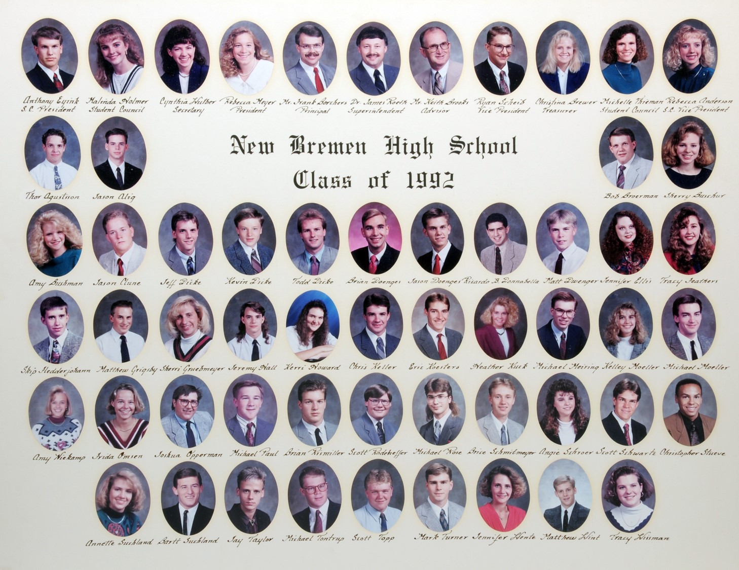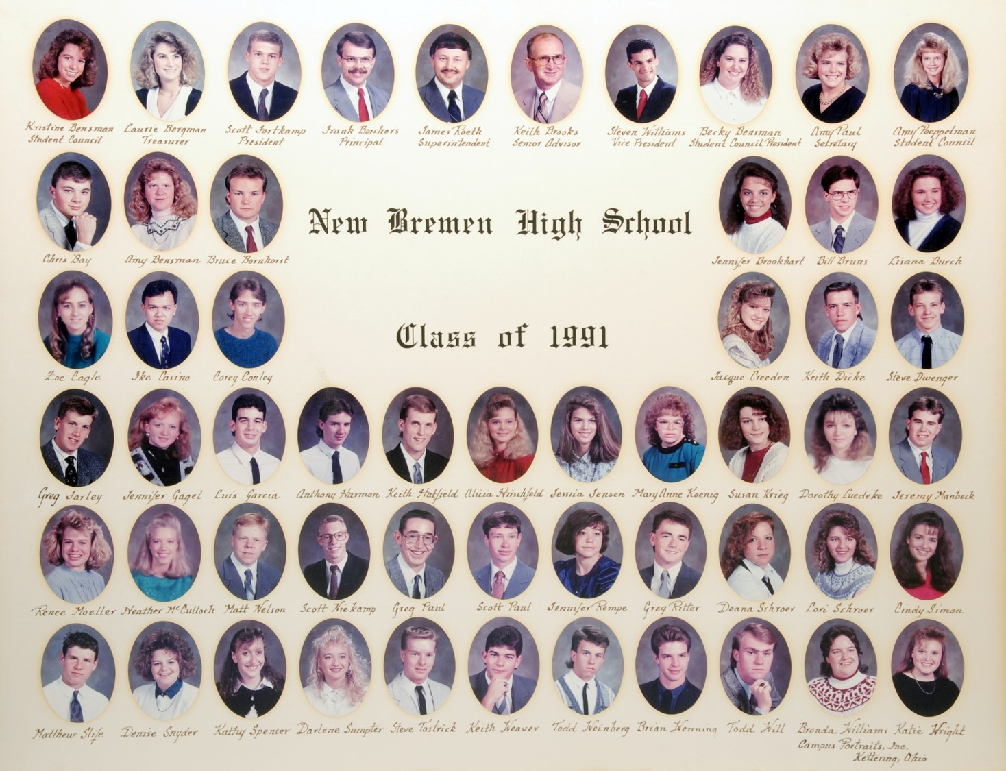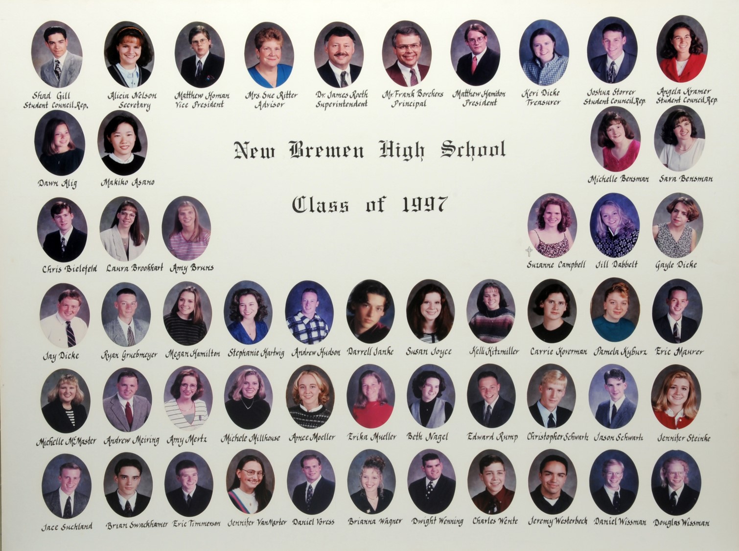 The New Bremen Historic Association, an Ohio non-profit corporation, is posting the graduation class lists and photos graciously provided by the Board of Education, New Bremen Local and the staff of the New Bremen High School. The New Bremen Historic Association has posted information on this website as a service to the citizens of New Bremen and past, present and future graduates of New Bremen High School. The New Bremen Historic Association is not responsible for the accuracy of the photos presented. These photos shall not be copied or distributed without the express written consent of the New Breme Historic Association and the Board of Education, New Bremen Local School District.
