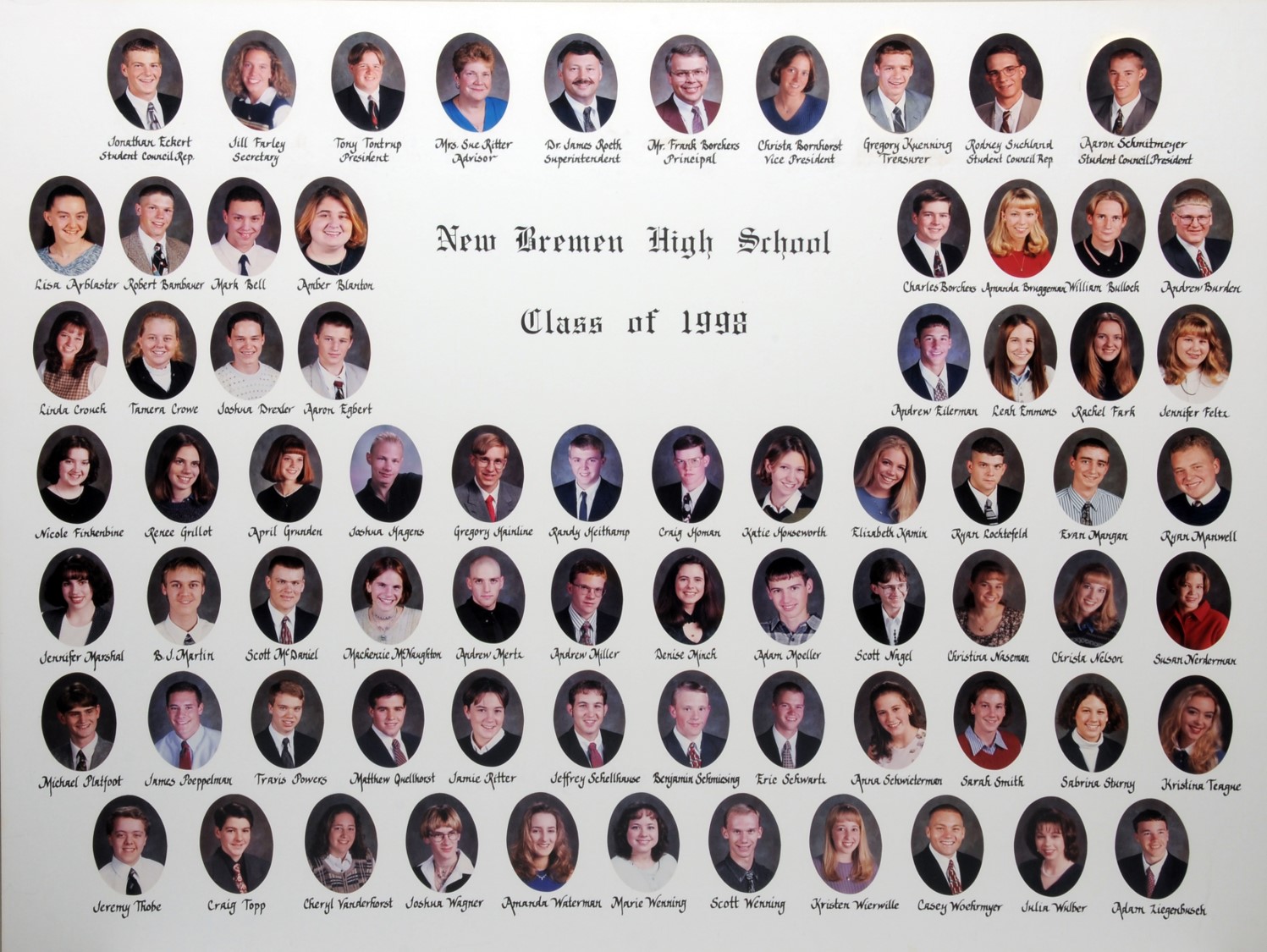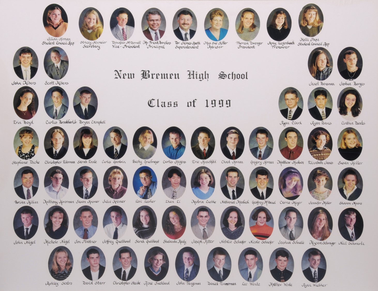 The New Bremen High School was first organized in 1879 with a three-year course which was changed to a four-year course in the fall of 1899. The following is a list of all N.B.H.S. graduates, starting with the class of 1980 up to 1999. We have attempted to identify the students as to who their parents are for genealogical purposes. There are some lapses. If you have any additional information to add (or corrections to make), please contact us.